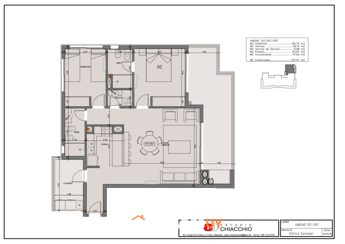 La unidad de la publicación es la 107, se trata de un apartamento esquinero con living comedor, amplio balcón con parrillero propio, cocina americana, 2 dormitorios (principal en suite y con acceso al balcón), 2 baños, toilette de visitas y terraza lavadero muy amplia. Cochera para un auto con baulera y previsión para cargador para autos eléctricos.